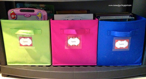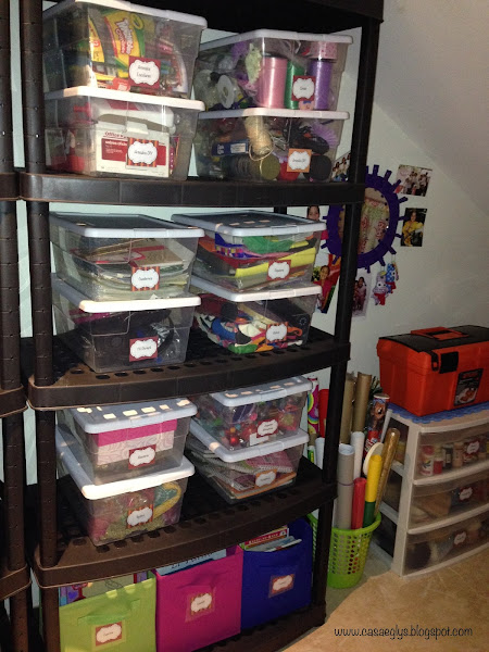 En la bodeguita y cuartito de juego, usamos contenedores para organizar todo lo referente a la escuela y a mis manualidades.