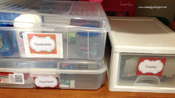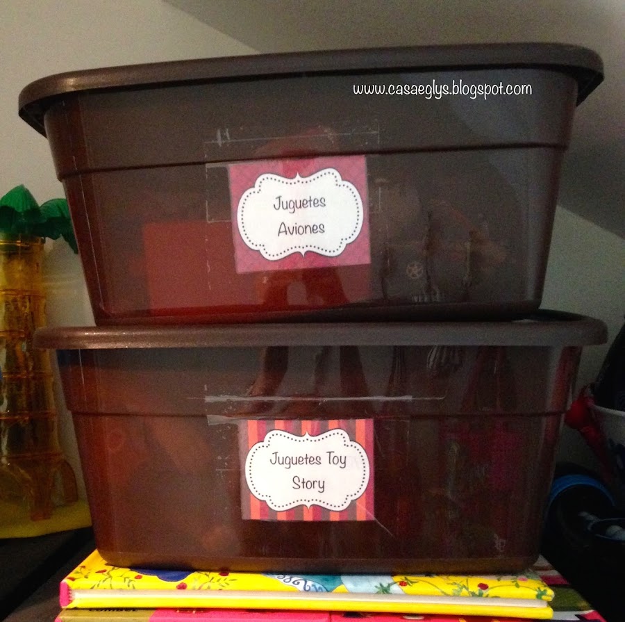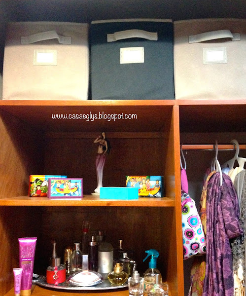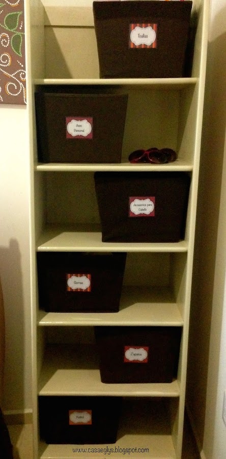 En la habitación, dentro del closet tenemos cajas de almacenaje de Martha Stewart, las cuales ya vienen con un compartimiento para colocar una etiqueta y poder identificar fácilmente lo que contiene la caja. En este caso son artículos que no usamos diariamente, por esa razón están en la parte alta del closet.
