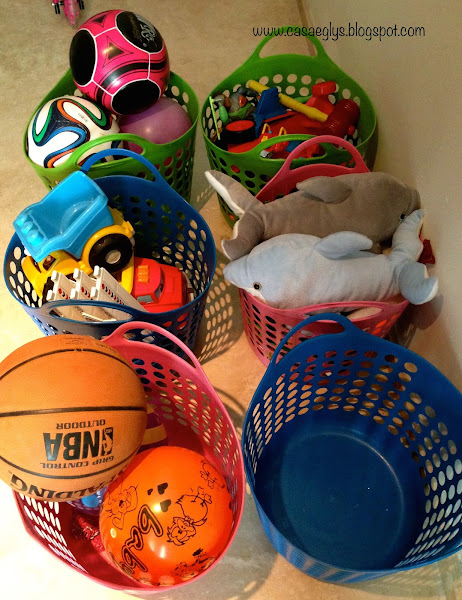 Usamos cestas de plásticos para organizar el resto de los juguetes, peluches y balones. Siempre tenemos una cesta vacía que sirve como "catch out basket", es decir para atrapar o recoger todo rápidamente y después organizarlo con calma en su debido lugar.