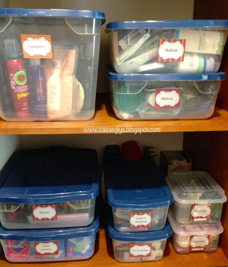 En el closet de blancos utilizamos contenedores de plásticos, donde organizamos todo lo referente a medicinas que no usamos a diario, suplementos de baño y artículos de aseo personal.