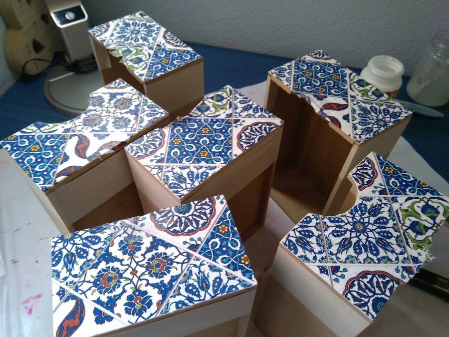 Al tener el papel esos motivos geométricos tan chulos, quería asegurarme de que cuando estuvieran los cajones terminados y en su sitio, el efecto visual fuera de continuidad, es decir, que no se vieran como descolocados... Yo y mis manías... Para conseguir esto, los enumeré y los uní con cinta de carrocero.