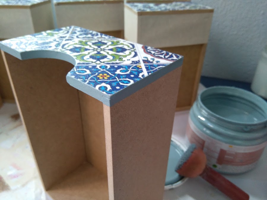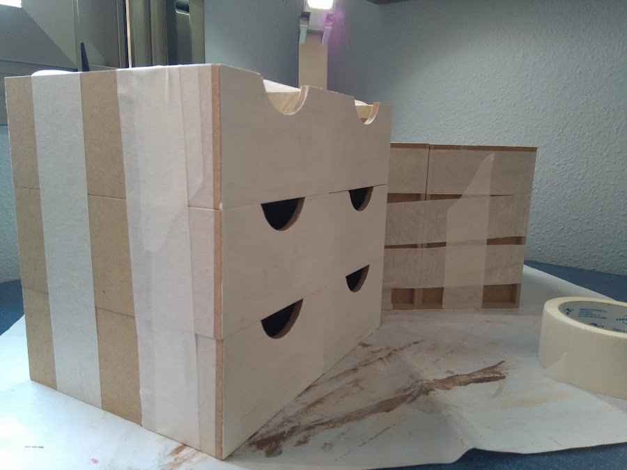 Estructura terminada, llegaba el turno de los cajones. Lo primero que hice fue lijarlos suavemente para quitar imperfecciones y posibles astillas de los bordes. Como solo quería decorar la parte visible de los cajones, puse cinta de carrocero para proteger el resto y que el corte entre la pintura y la madera quedara recto.