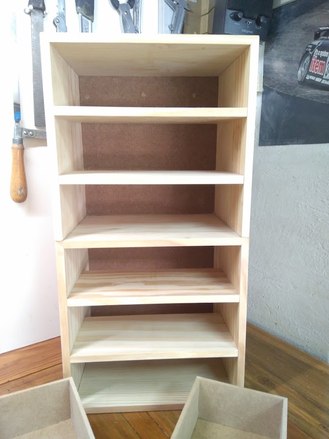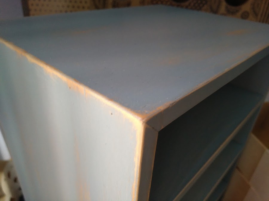 También compré una balda de madera y pintura efecto tiza en un tono azul turquesa, me vine para casa y probé que mis nuevas cajoneras entraran bien en el hueco que yo quería, una encima de otra. Peeeero, sobraba justo un centímetro de las cajoneras, justo lo que mide una balda de las horizontales, así que pedí ayuda a mi progenitor, quien le quitó una balda superior a una de ellas y las unió para formar una sola cajonera.