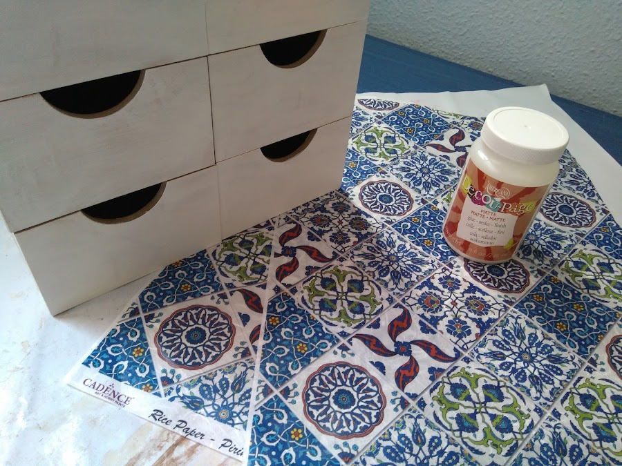 Una vez seca la pintura blanca, llega el momento del decoupage. Os enseño el papel de arroz que compré de la marca Cadence en una tienda de manualidades de Córdoba, y la cola para decoupage que utilicé.