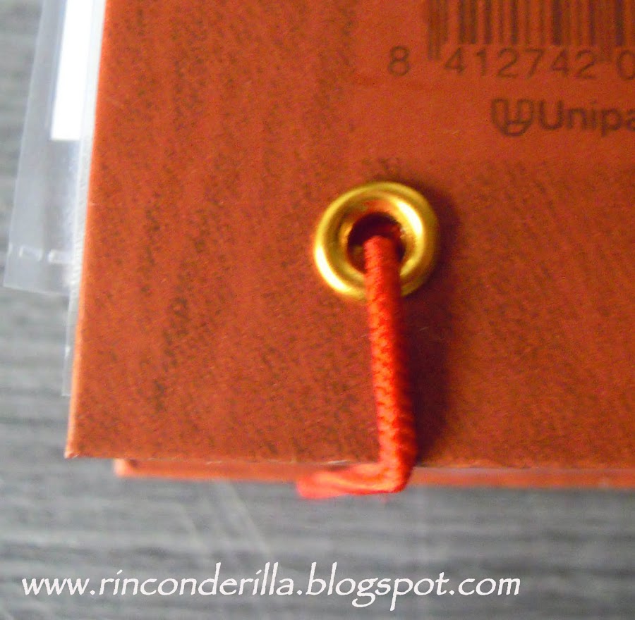 En el archivador le puse un cierre, que hice con dos ojetes (eyelets) y una goma.