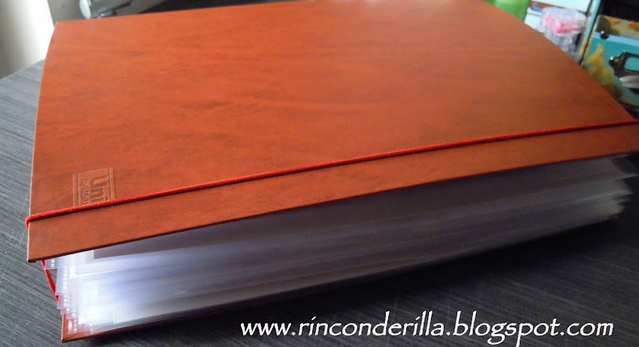 Después compré unas fundas de plástico transparente en las que puse un folio y una hoja de acetato para que se peguen los sellos y no se muevan, además en el folio puse el nombre, la marca y el número de referencia. Esto para los sellos de fondo, y los paquetes grandes, debido a que no he encontrado las fundas de A4 divididas a la mitad.
