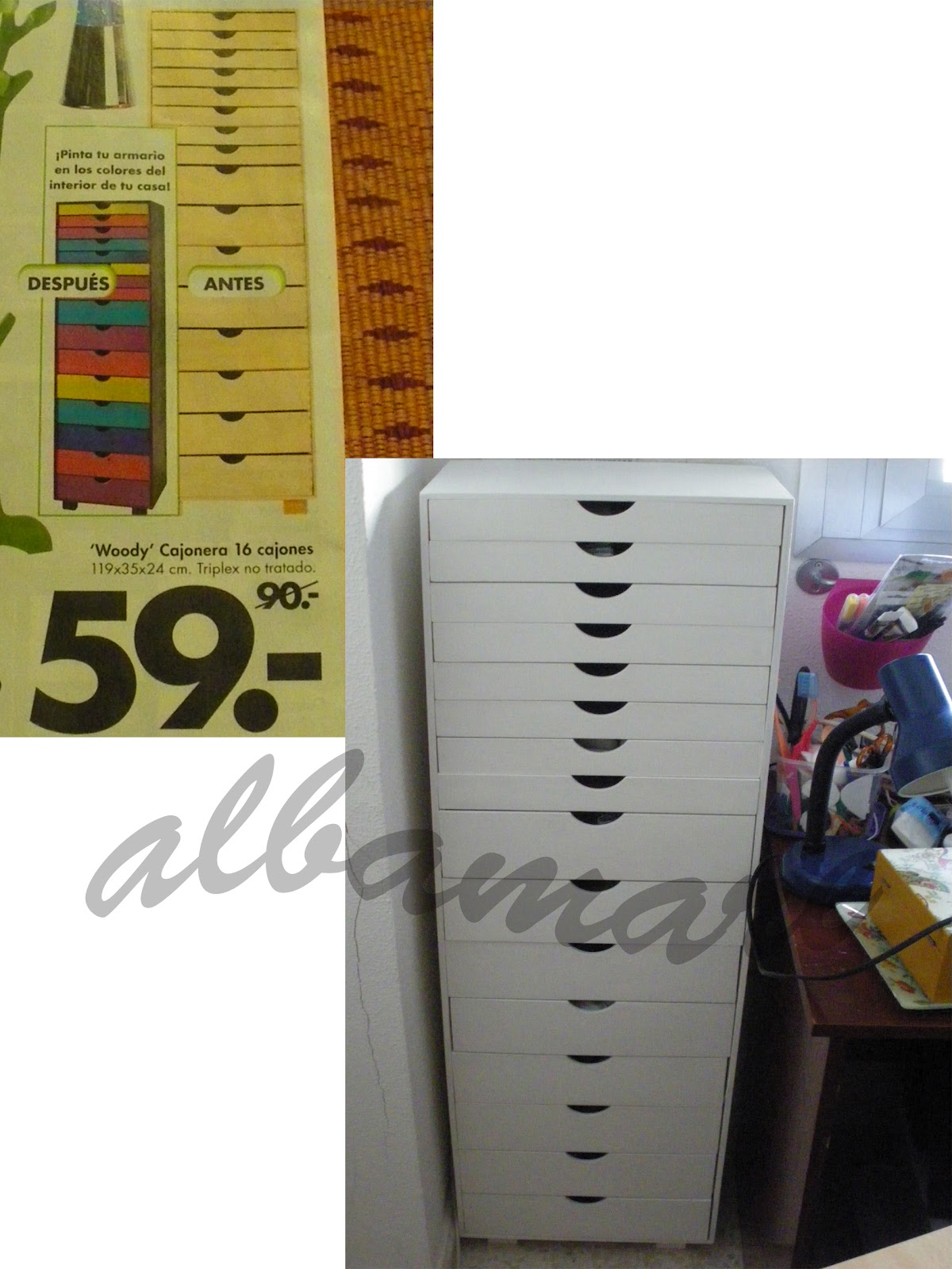 Últimamente vengo teniendo problemas de organización con mi lugar de trabajo y, os adelanto una primera vista de mi rinconcito, porque quiero que podáis aprovechar la oferta de este mueble que os presento, por si os interesa.