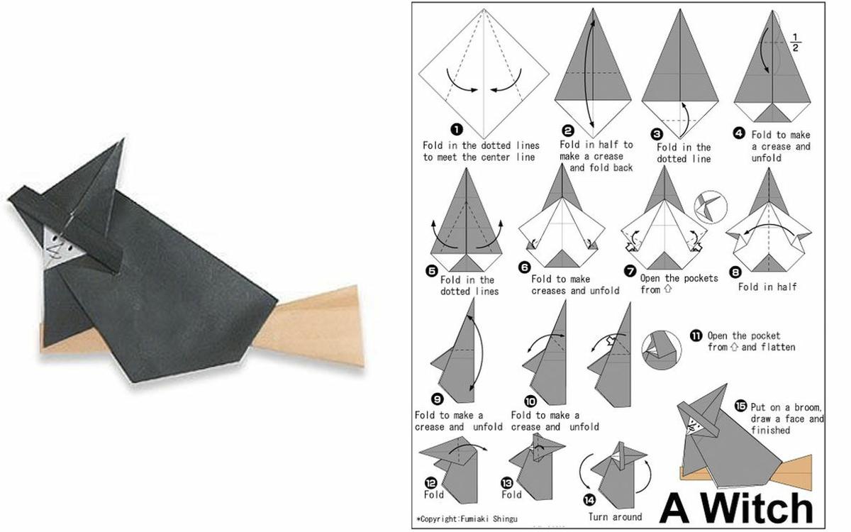 Una figura de origami sencilla y muy resultona es la bruja qué podemos caracterizar de una forma muy simpática y además podemos hacer algunos de sus complementos como por ejemplo la escoba o el sombrero y porque no un fantástico gato negro.