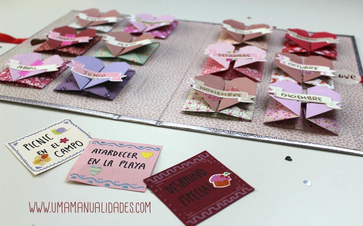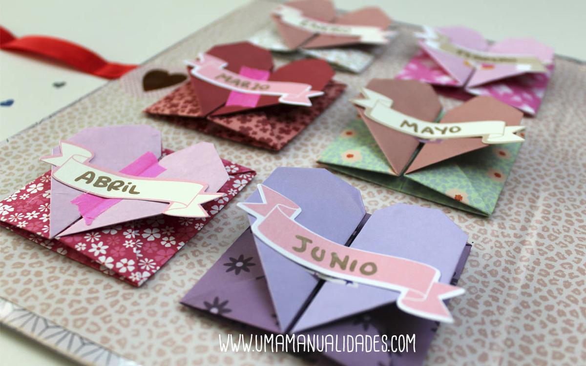 La presentación además es muy llamativa porque son sobres de origami en forma de corazón que al abrir contienen sorpresas, y si combinamos varios papeles en tonos rosados y rojos ¡quedará genial! ¿Creéis que esa persona especial será capaz de no abrirlos todos antes de tiempo?