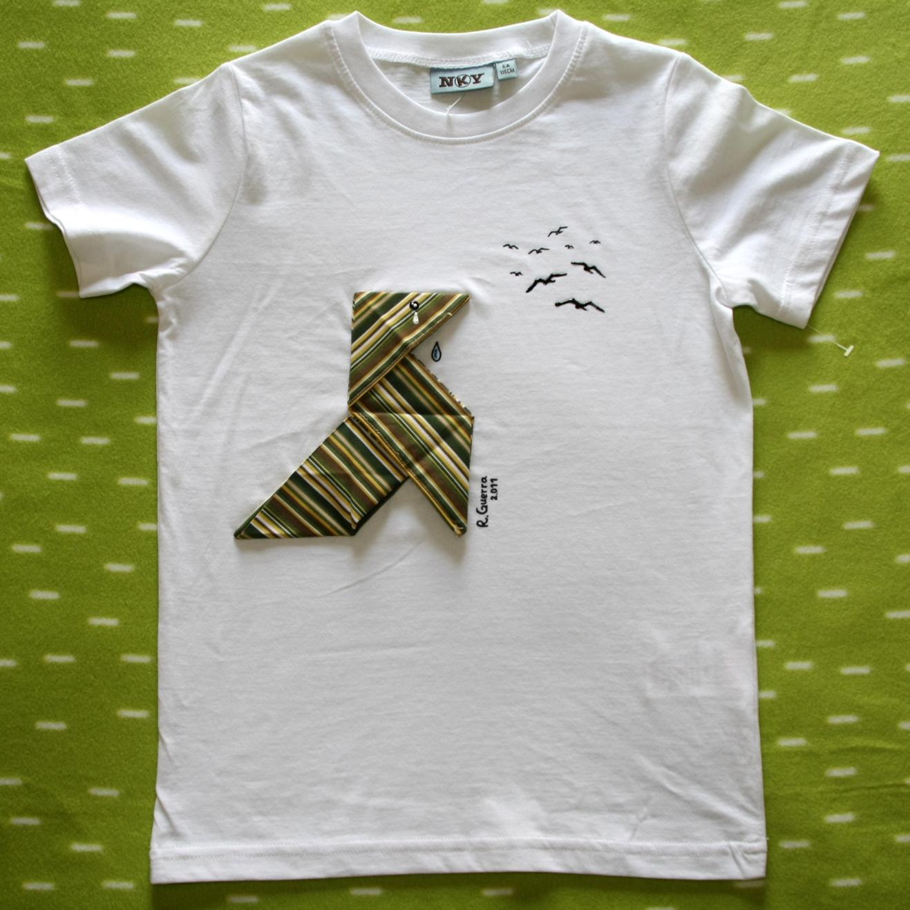 CAMISETA "QUIERO VOLAR..." DETALLE DE DIBUJO VISTA 3D DE PAJARITA "DE PAPEL"