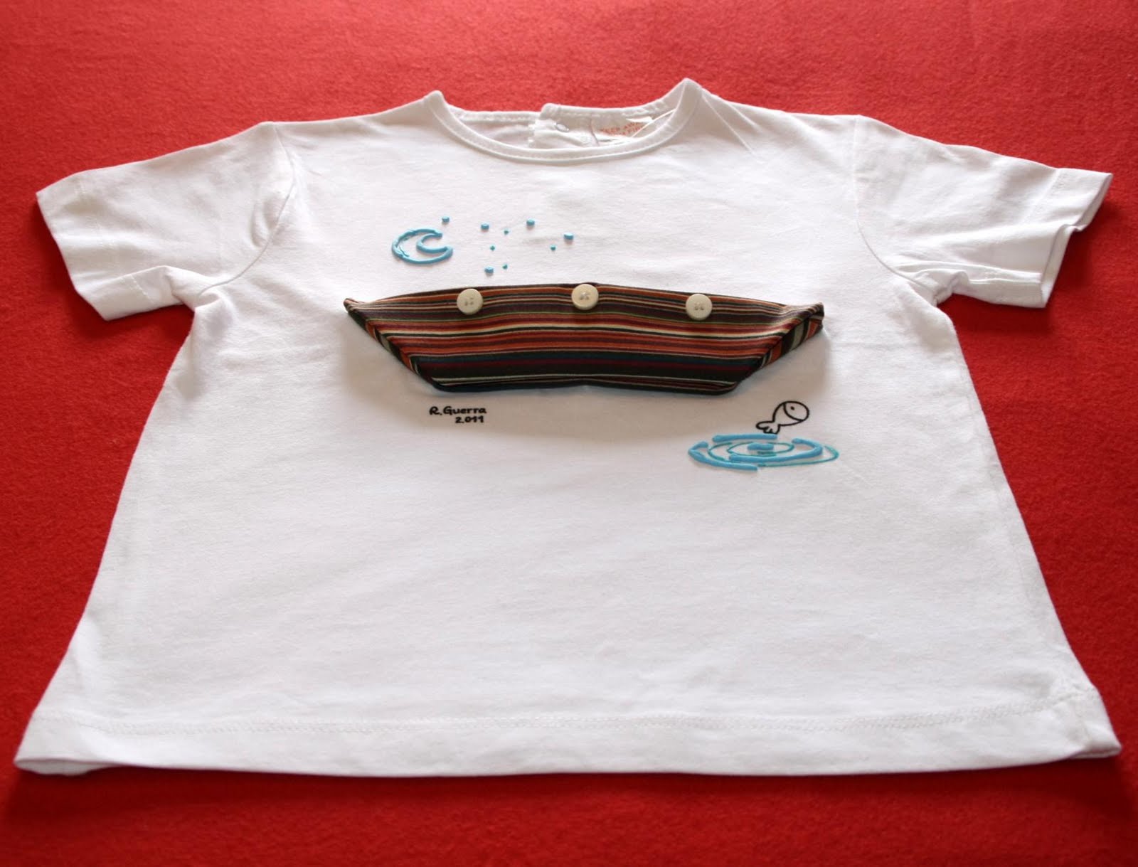 La primera que os enseño es la del pequeño, que ha sido un nuevo modelo que se me ocurrió. Llevaba ya algún tiempo con la idea de hacerla y ahora encontré la oportunidad perfecta para llevarla a cabo. A esta camiseta la he llaado "Había una vez una barquito chiquitito...". Os enseño las fotos y no me lío más: