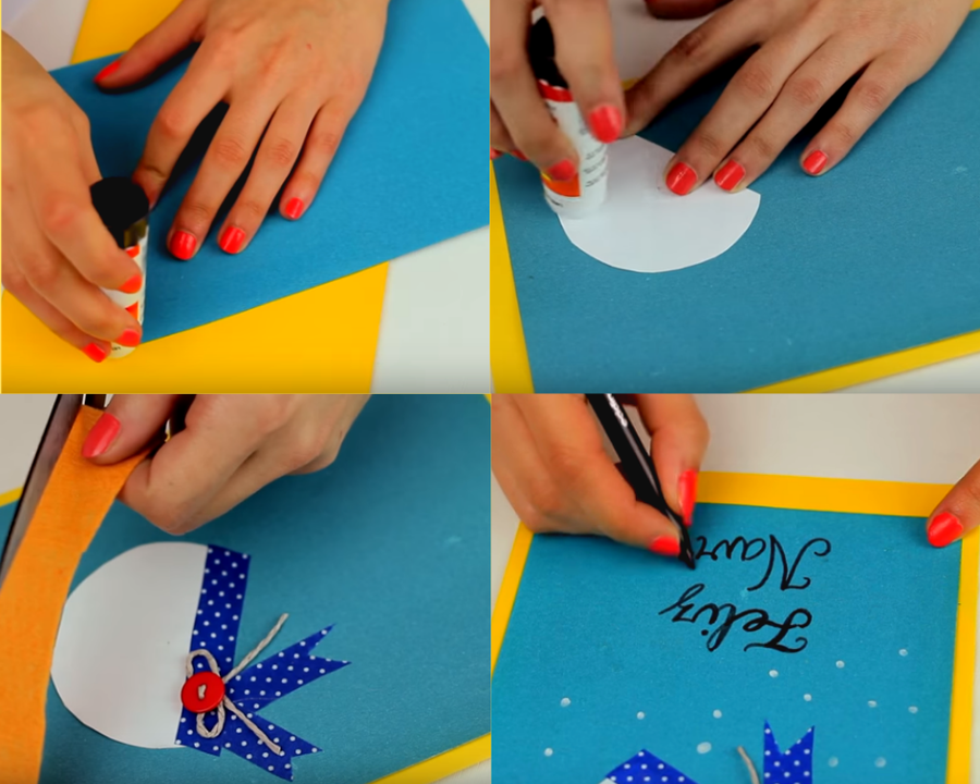 -En tercer lugar, con el washi tape formamos una especie de bufanda para el protagonista de nuestra postal. Encima pegamos el botón y la cuerda con la silicona caliente.