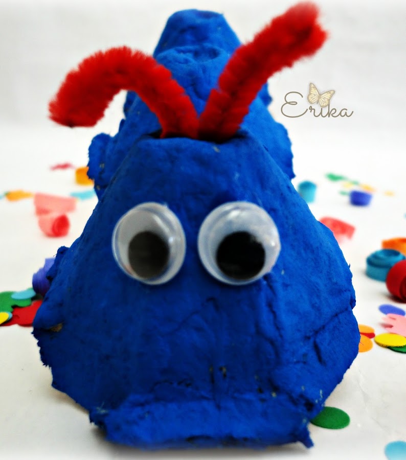 Cortas el cartón de huevo del tamaño deseado , pintas con un pincel , dejas secar , pegas los detalles con silicona caliente o fría y listo .