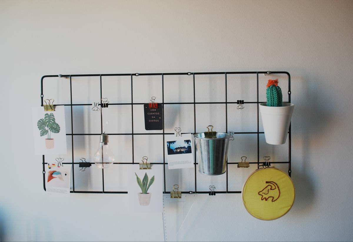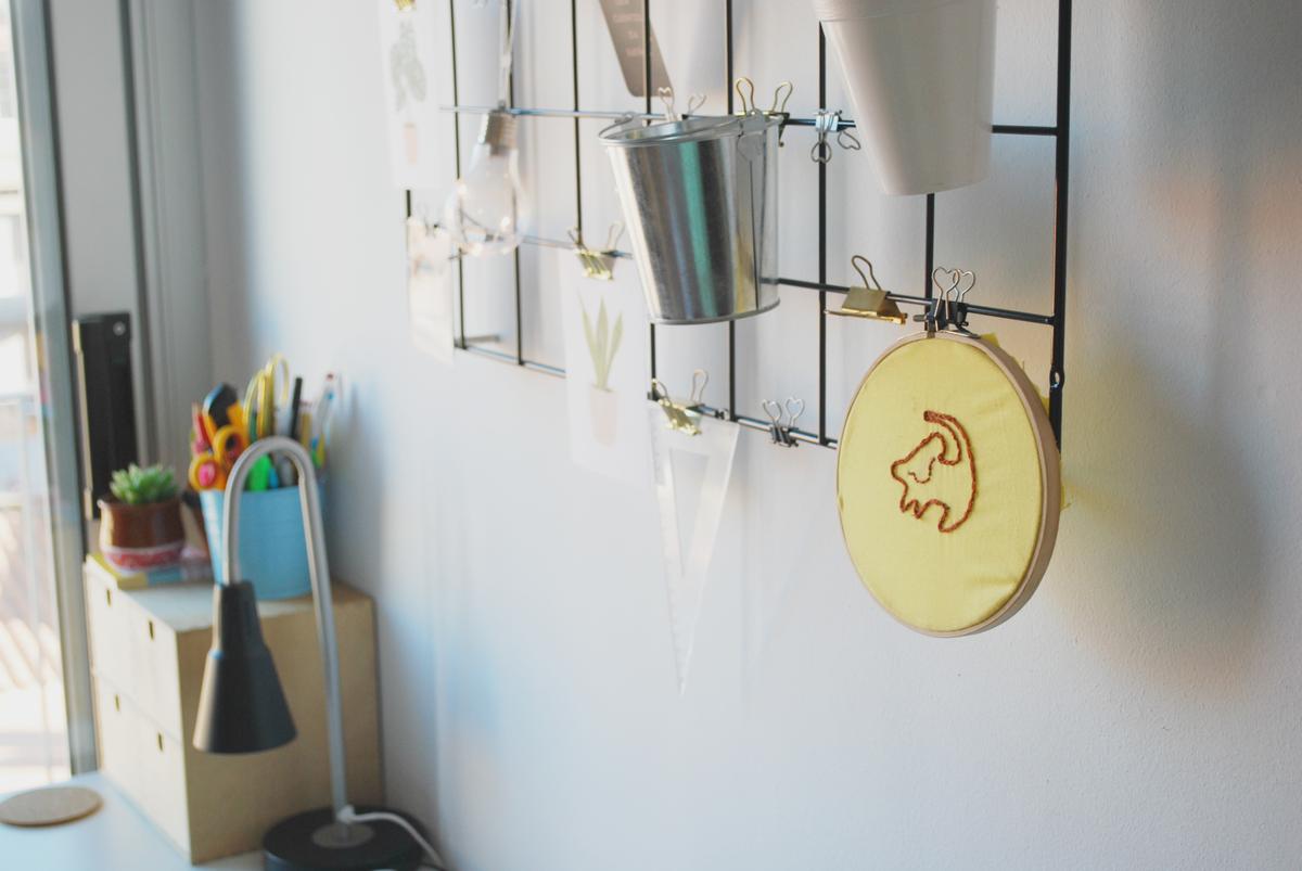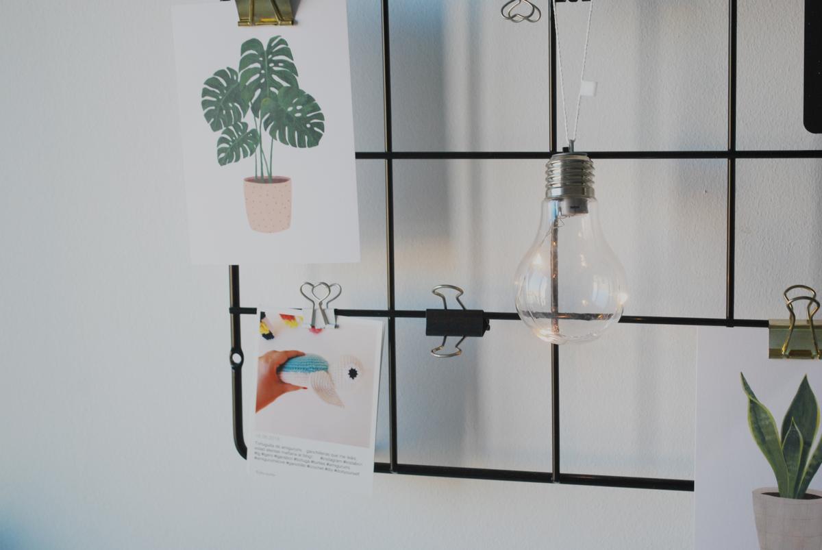 Justo encima he colocado una de las rejillas que seguro que habéis visto en un montón de sitios, pero que van genial para colgar notas, láminas, y cosas que quieras tener a un golpe de vista.