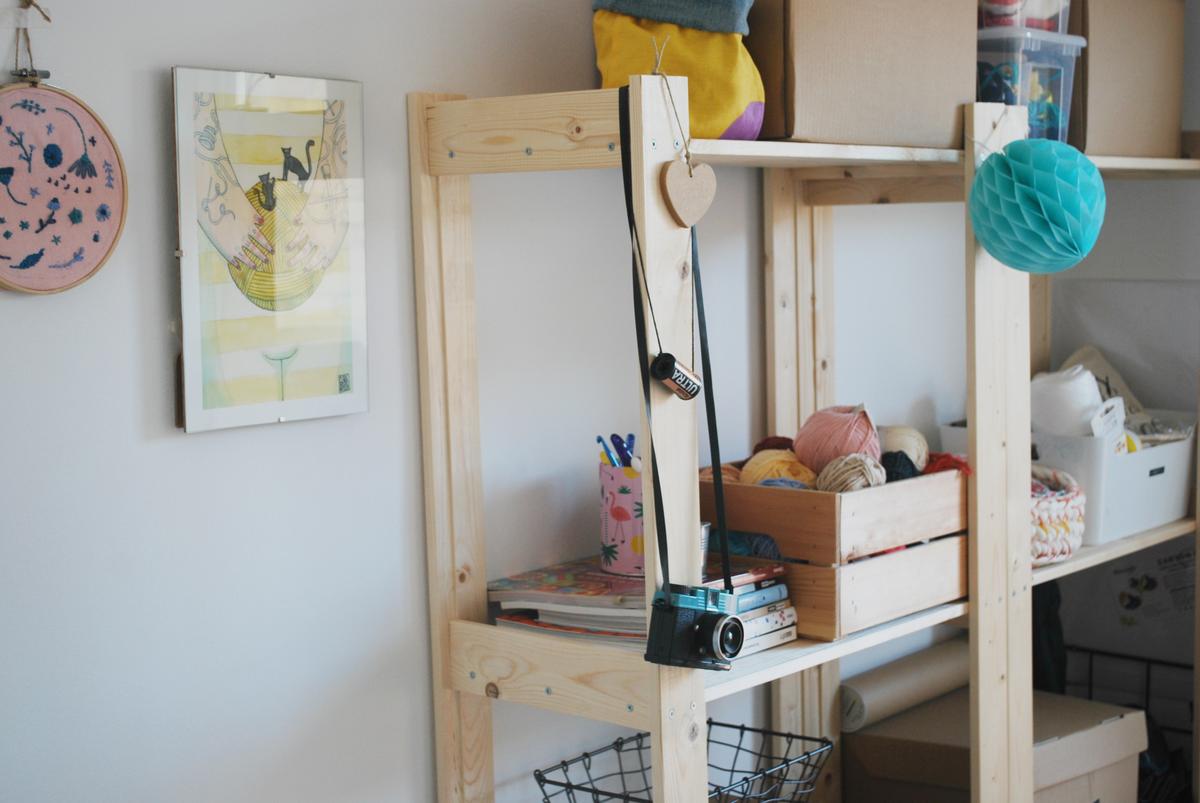 Por último, detrás he colocado dos estanterías ALBERT de ikea, cuestan 9,99 y para lo que yo necesito, son perfectas.