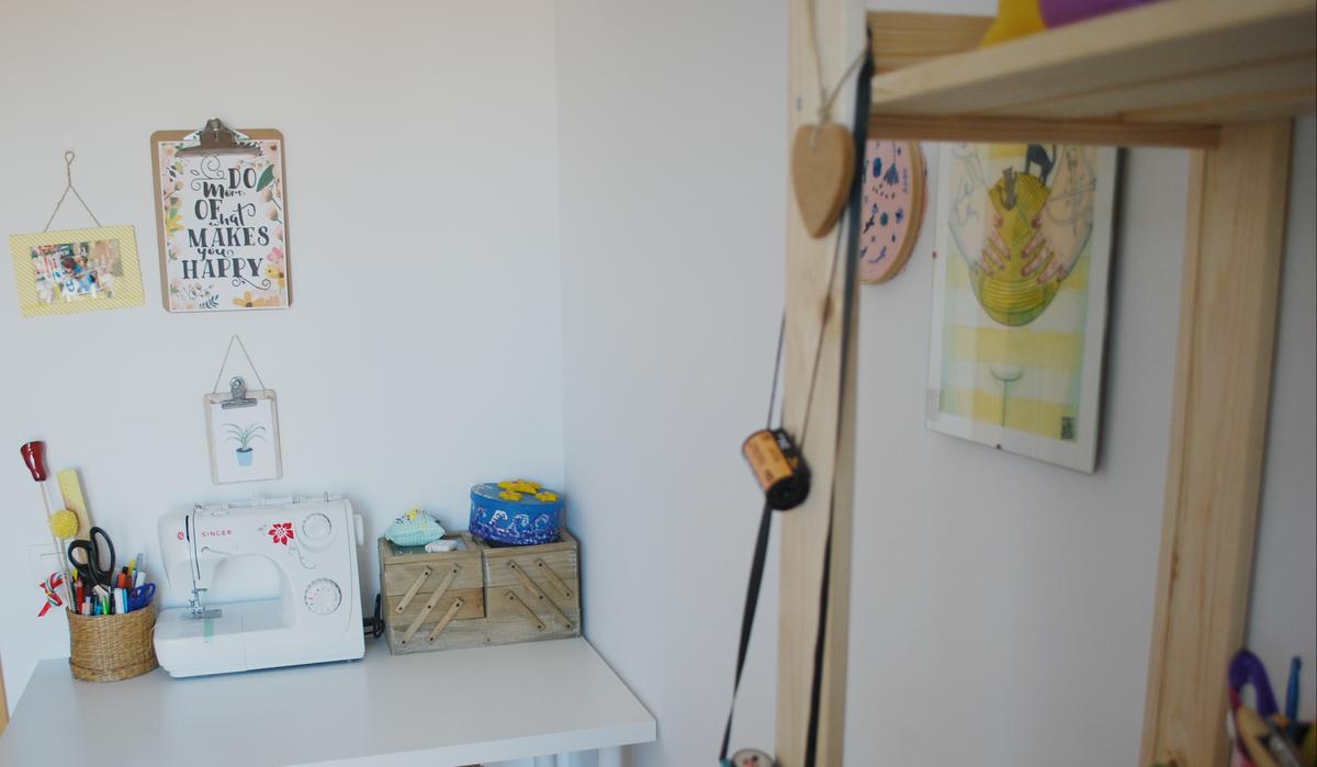 Por una parte está la zona de costura, con la máquina de coser y todo lo que necesito. Tengo que decir que esta es una de las cosas que más necesitaba, por que en mi casa tenía la máquina de coser en otra habitación y cada vez que quería coser algo tenía que montar un traslado entero, así que el hecho de poder mover la silla y ponerme a coser lo que necesite es genial.