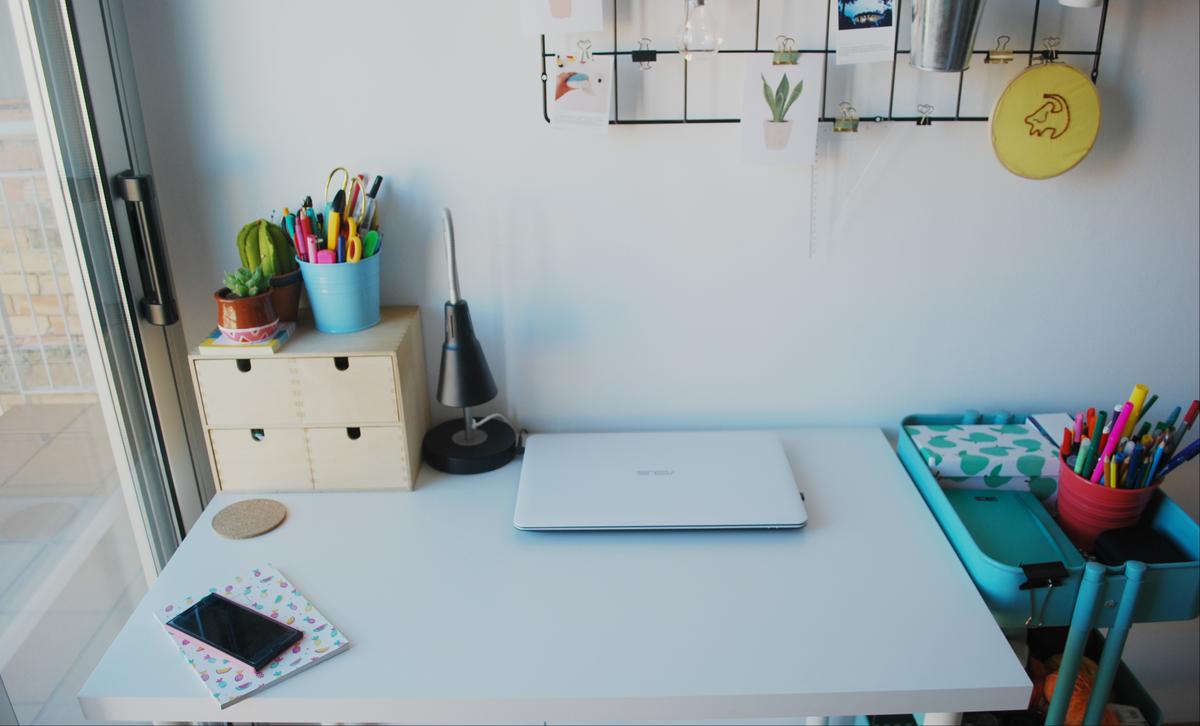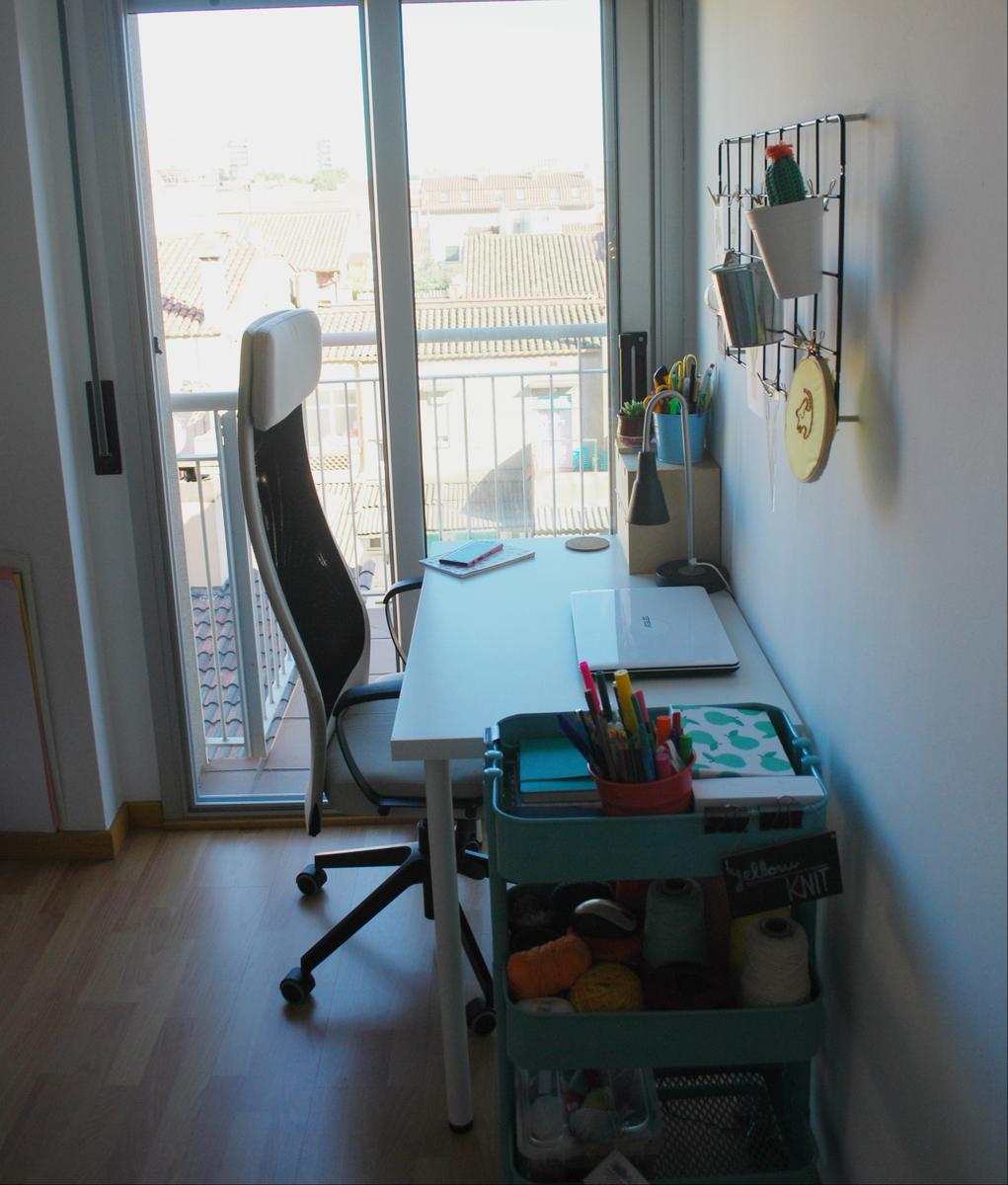 Al lado del balcón (en nuestro piso no hay ni una ventana, todo son terrazas o balcones) he montado el campamento base con el ordenador, el famoso carrito de ikea que viene conmigo a todas partes y todo lo que necesito tener más a mano.