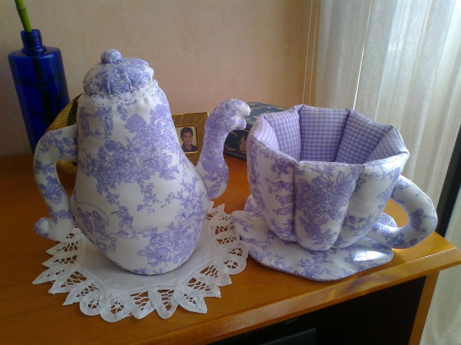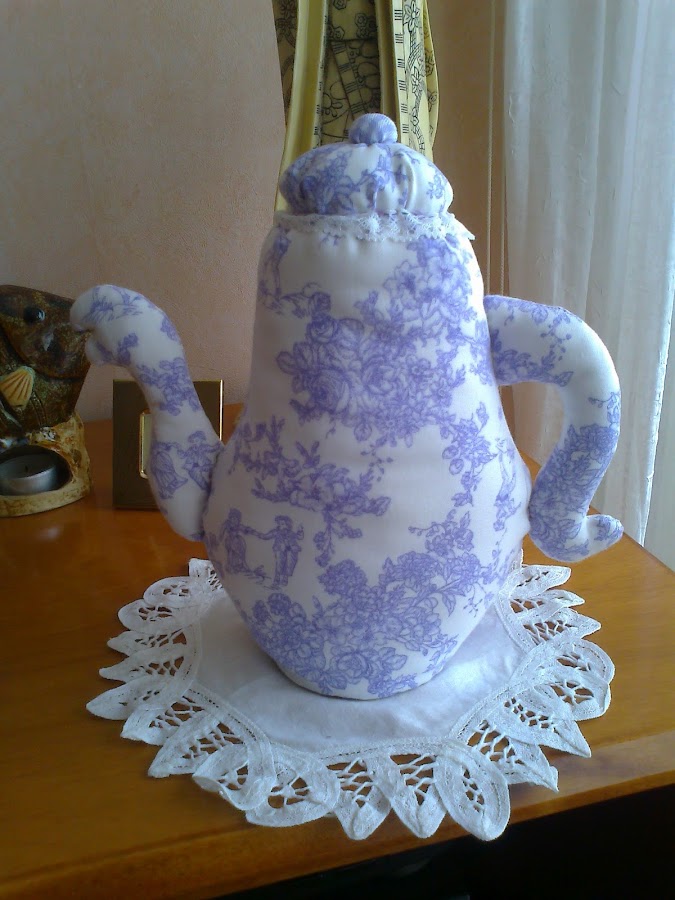 despues taza hice esta tetera a juego junto con el mantelito, todo en toile de jouy, como ya sabreis lo mio no es la fotografia, la verdad que queda mucho mas bonito al natural. os pongo las fotos haber que opinais.