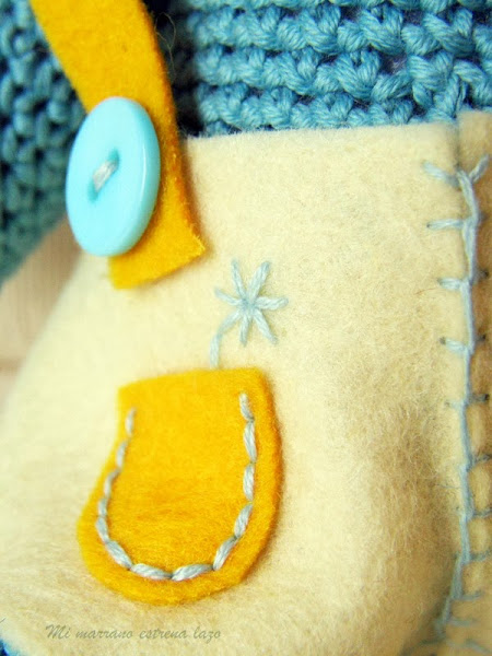 Va vestido con un pantalón amarillo pastel, con tirantes amarillo oro y un bolsillo del mismo color, que si te fijas bien, lleva una flor ;) botones azul claro y un sombrero la mar de gracioso con dos plumas de adorno, para pasar desapercibido por el bosque, dice, jejeje.