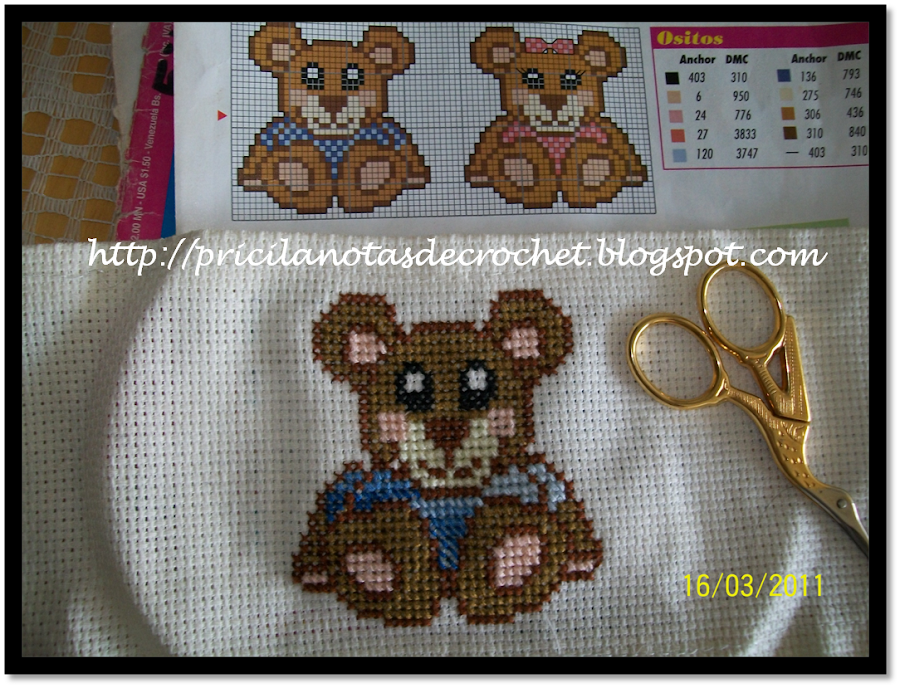 Hola chic@s!! Hoy quiero presentaros algunas de mis creaciones a punto de cruz. En este caso se trata de dos diseños de baberitos, para niño y niña, con un tierno osito. La cara del osito resulta ideal para baberos pequeños, puesto que queda muy centrada y se le puede añadir patitas o corazoncitos como yo he hecho.Muchas de vosotras me habéis escrito pidiendo los patrones de algunas de las creaci ...