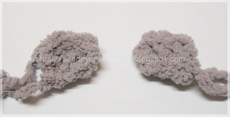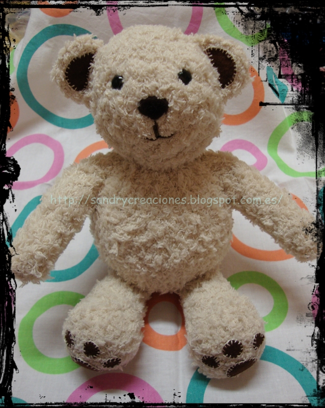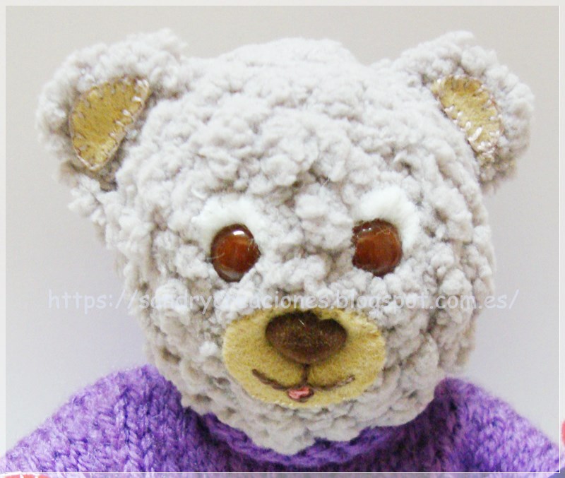 Parte interior de las orejas: pieza de fieltro marrón claro en forma de media circunferencia que pegué con silicona caliente al osito y cosí con punto festón.