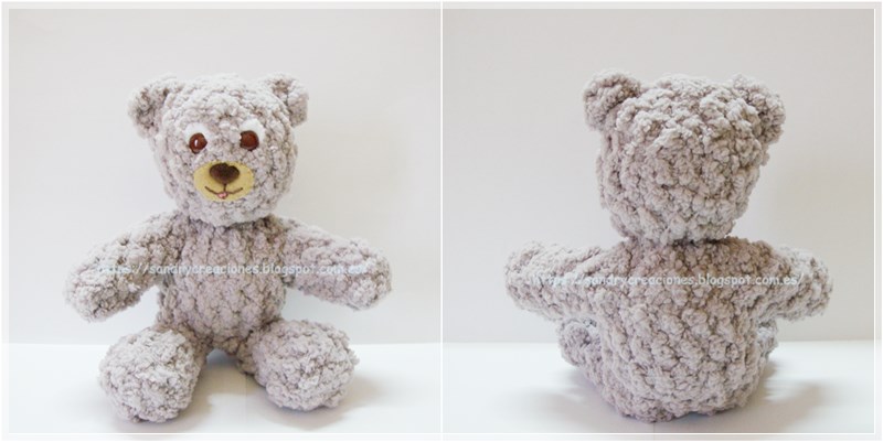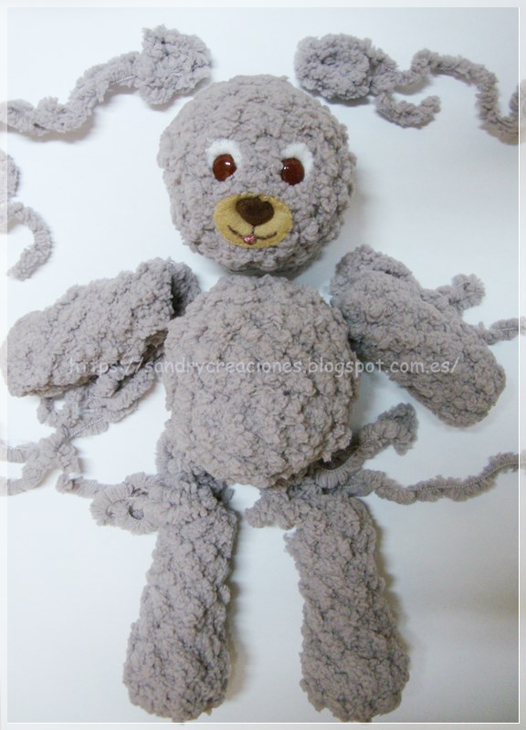 Una vez tenemos realizadas todas las partes del osito, cabeza, cuerpo, brazos, piernas y orejas, procederemos a juntarlas cosiéndolas. Yo he cosido el osito en posición de sentado pero podéis coser sus piernas como queráis.