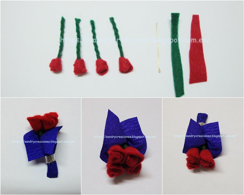 Ramo de rosas: Para realizar las rosas utilicé 4 alfileres de bisutería, tiras de fieltro verde y tiras de fieltro rojo. Cubrí los alfileres con la tira de fieltro verde que fuí pegando en espiral alrededor del alfiler con silicona caliente. Seguidamente con la tira de fieltro rojo fuí formando la parte superior de la rosa pegándola con silicona caliente. Una vez realizadas las 4 rosas las uní por la parte inferior con silicona caliente, les puse un trocito de papel crespón y este lo até con un trozo de cinta plateada que pegué con silicona caliente.
