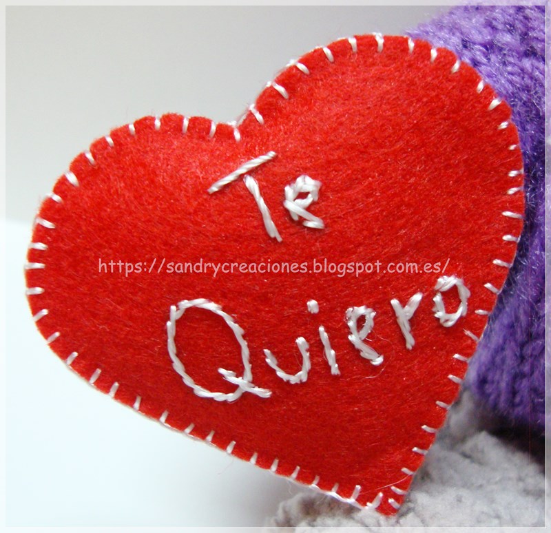 Corazón con mensaje: para realizarlo recortamos dos piezas de fieltro rojo de la medida que queramos y que necesitemos según el mensaje que le queramos bordar. En una de las partes bordamos el mensaje, en nuestro caso he bordado "te quiero", y después las juntamos cosiéndolas a punto festón teniendo en cuenta que antes de terminar de coserlas rellenaremos un poco el corazón con algodón sintético para darle un poco de volumen.