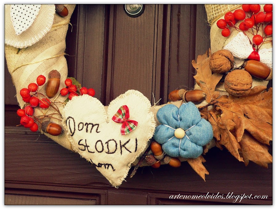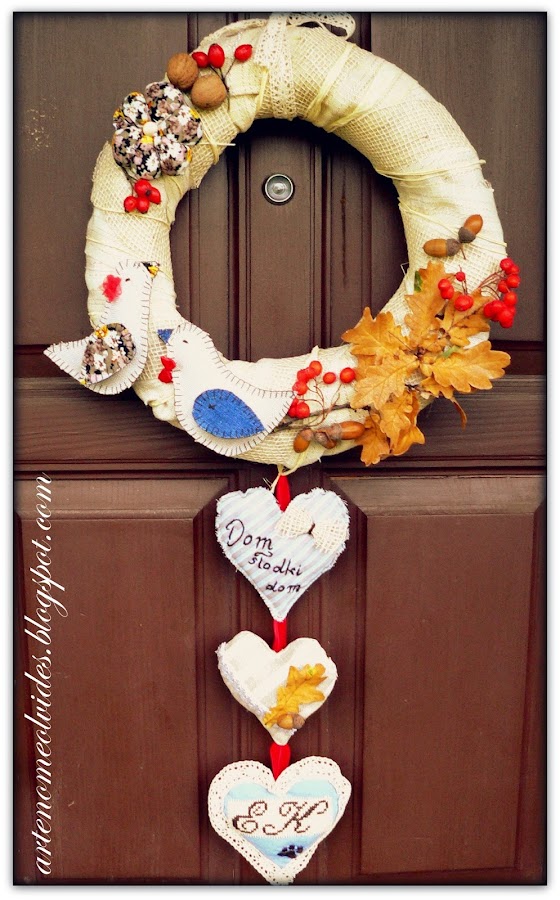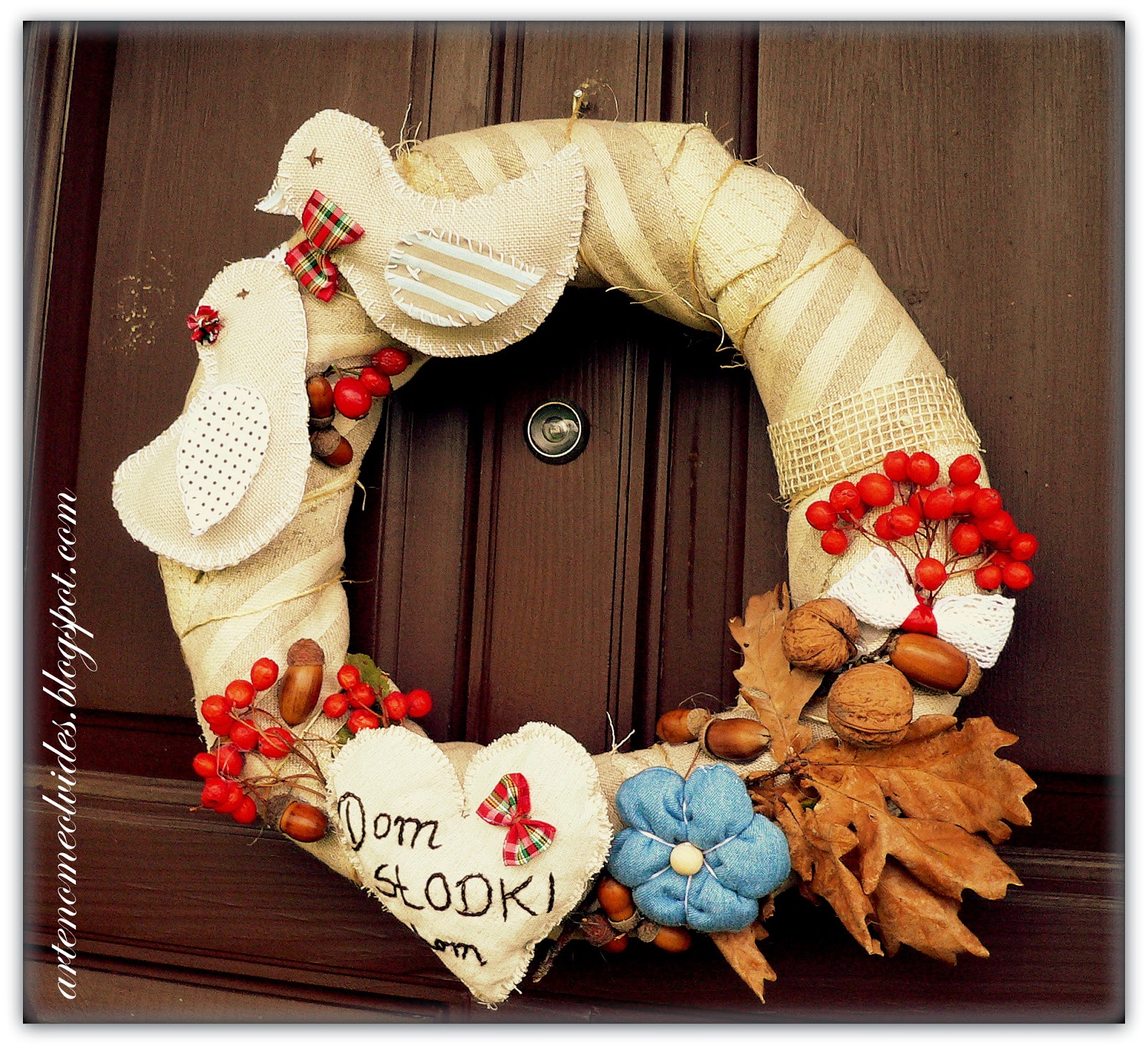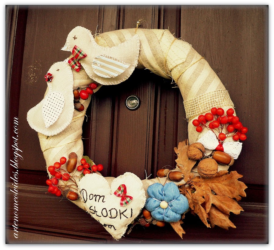Wykorzystuj?c dary jesieni stworzy?am dwa wie?ce na drzwi. Wn?trze to gazety, dalej materia?y,ta?my, koronki i co tam pod r?k? mia?am.