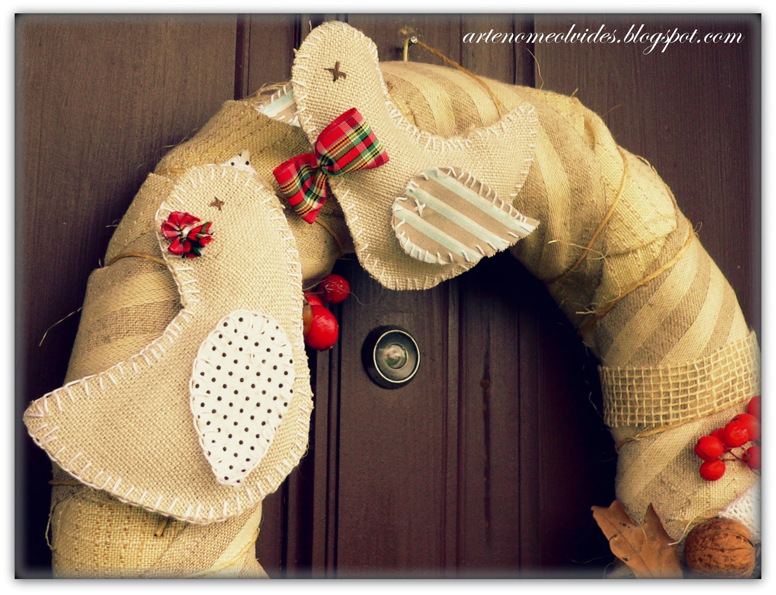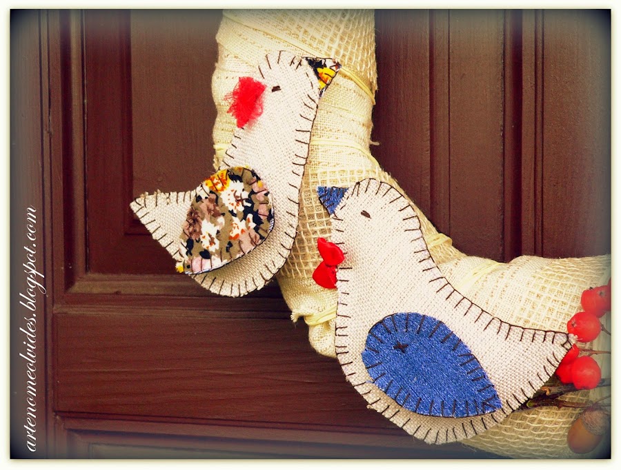 Aprovechando regalos de otono hecho dos coronas para la puerta. La base son periodicos, despues telas, cintas y lo que tenia en casa:)