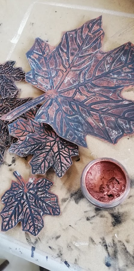Después de secarse bien la Foam paint (mejor de un día para otro) ya se puede colorear si se quiere....yo le he dado color terracota, blanco a pincel seco y por último en los relieves con el dedo, cera bronce.....