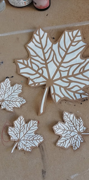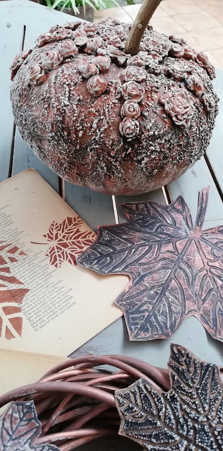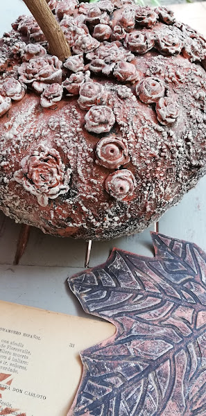 Luego las recorté y pinté como la calabaza....negro, terracota, blanco y cera bronce.