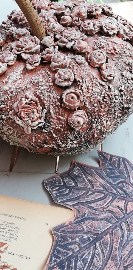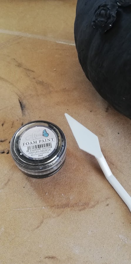 Aqui en la calabaza le di calor nada más extenderla. Con el calor la pintura hierve y se hincha como veis en la foto. Si la tocas está blandita como el Foam...de ahí su nombre....