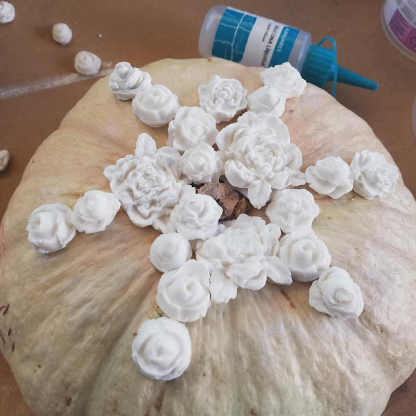 Todo empezó con la calabaza si.....tuve la idea de decorar una y sin saber cómo lo iba a hacer empecé a hacer rositas con uno de los nuevos moldes de silicona y porcelana fria.