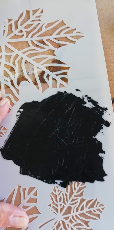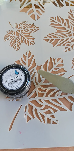Sobre el negro fuí aplicando con espátula este nuevo producto....la pintura Foam paint, es en realidad como una pasta ligera. Tiene la propiedad de hincharse cuando se le aplica calor.