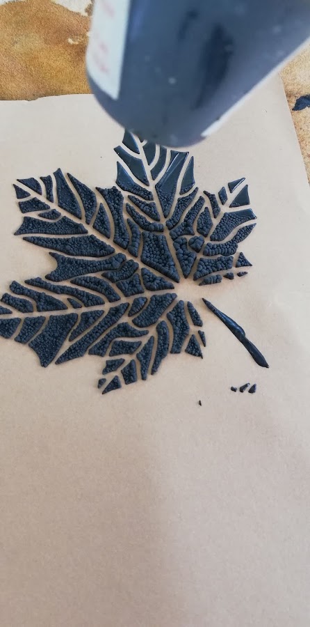 Extiendo la pintura-pasta sobre la plantilla, la retiro e inmediatamente le doy calor