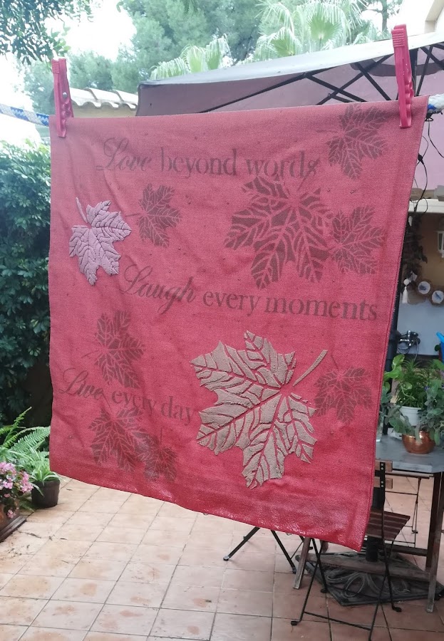 Terminé de decorar el almohadón estarciendo otros motivos con pintura textil normal.