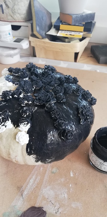 Una vez pegadas las rositas con silicona liquida, lo pinté todo con el negro de las Chalk paint Mya