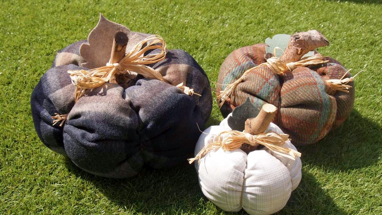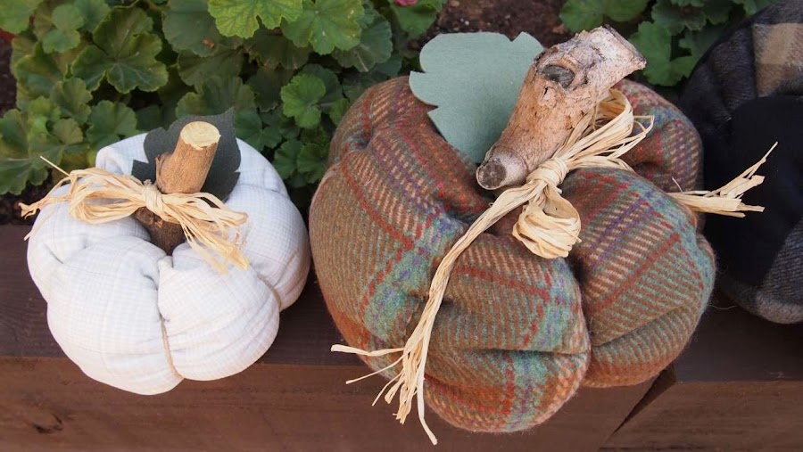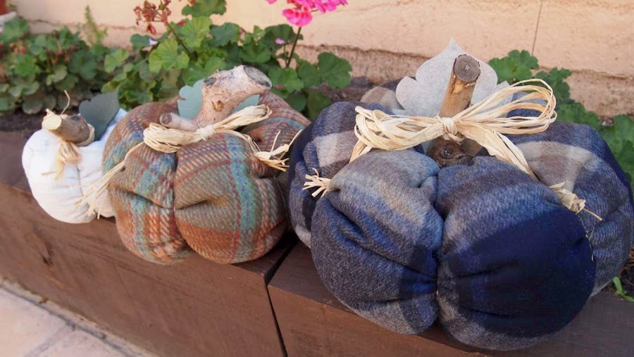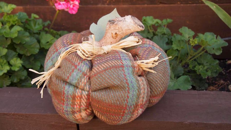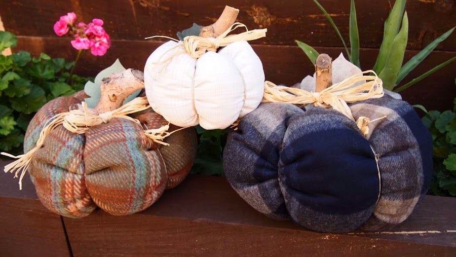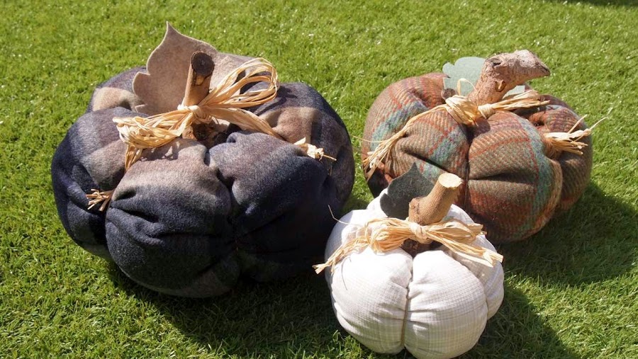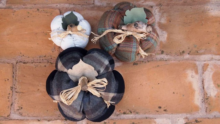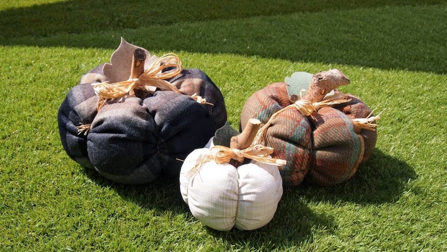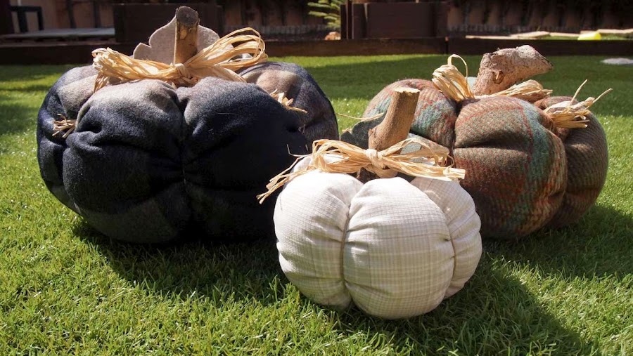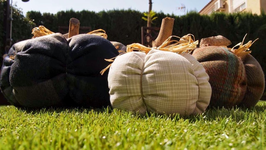 Estando así el tiempo y yo débil todavía, no tenía ganas de empezar un proyecto nuevo, pero sí ir haciendo alguna cosita, y es que el vicio es el vicio y no perdona ni en las convalecencias. Me apetecía, desde hace ya tiempo, hacer unas calabazas. De hecho esta idea la he tenido en mente todo el verano y estaba deseando que llegase este tiempo para poder hacerlas y lucirlas en casa. Así que me puse manos a la obra, busqué telas muy abrigadas y de colores otoñales y encontré unas de lana que compré hace tiempo.