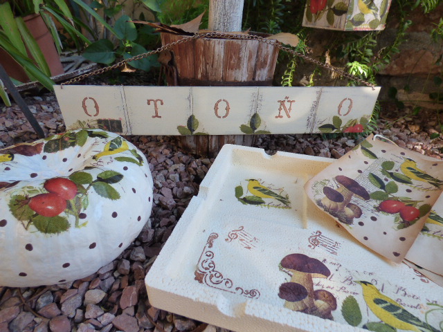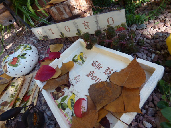 Y por último un retalito de madera que tenía por aqui en casa....mira qué casualidad que la madera tenía 5 cuadraditos, como la palabra O T O Ñ O......así que.....pintar, decapar, decoupage, estarcido.....