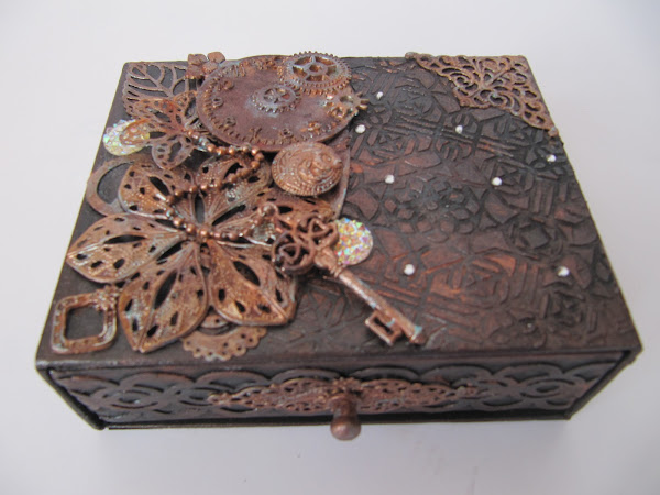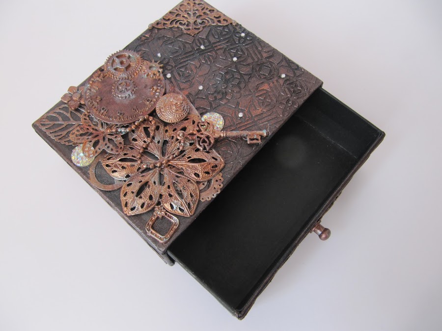 He utilizado pinturas metalizadas varias de la gama de los cobres con toques de azul turquesa y pizarras. Normalmente las aplico con los dedos, sin ton ni son hasta conseguir el tono que me gusta, tengo que decir que me sorprendió lo que cubre el gesso de Carrotcake de Vallejo, y la patina a la cera de Stamperia, productos que era la primera vez que he utilizado y que me han gustado mucho