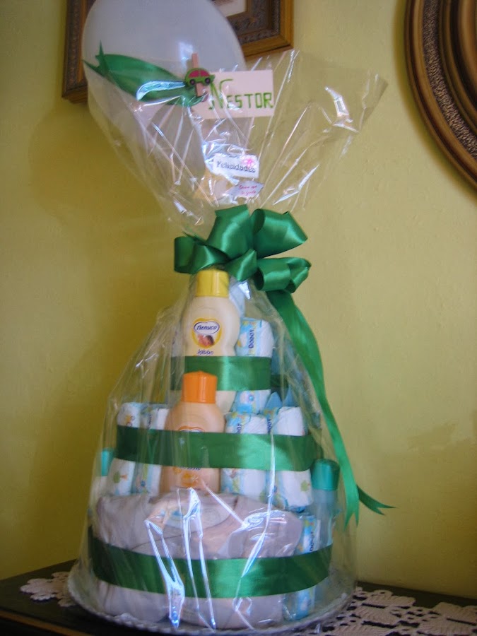 Otra bonita tarta de pañales que ha ido a casita de Jose Angel para que sus papis hagan buen uso de las cosicas que lleva incluidas . Y dentro de poquito otra más.