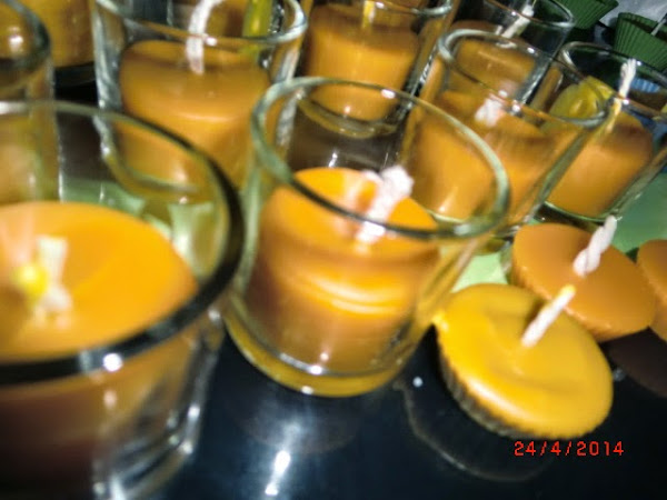 Más tarde incluí pequeñas velas de cera virgen 100 % que aunque son deliciosas con su olor a miel y a su gran heroismo en no hacernos respirar humos tóxicos, no tienen más secreto por explicar que se fabrican derritiendo los bloques de cera y vertiendo, cual jabón de glicerina. Incluso más fácil.