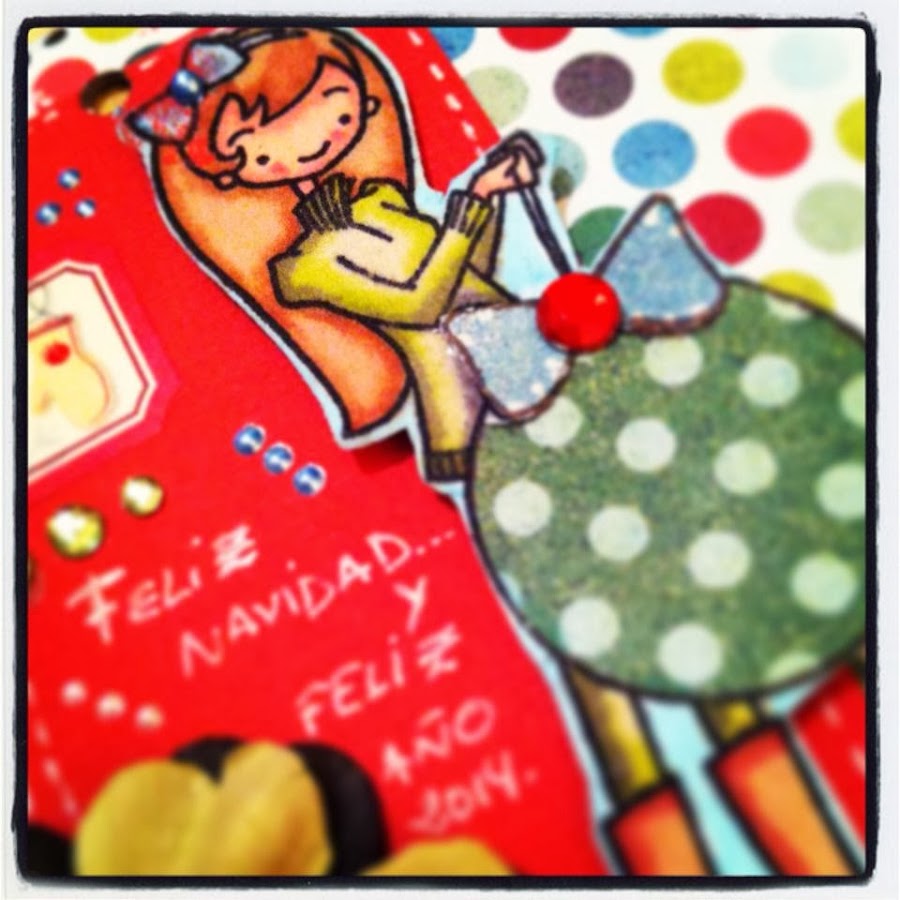 Hoy os enseño una tarjetita de encargo para un cumpleaños con marcapáginas de regalo ;) Con cartulina kraft, papeles de Echo Park y nubes estampadas he hecho el fondo. Los papeles van cosidos a mano y el mensaje está embosado en blanco. Los globos y la muñeca están coloreados con copics, además el vestidito de la muñeca y el lazo están hechos con paperpiercing y los zapatos tienen toque de glossy ...