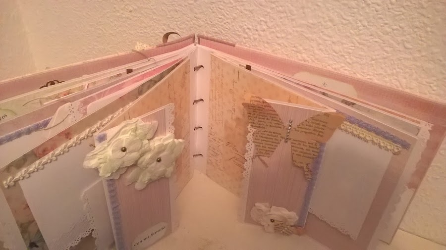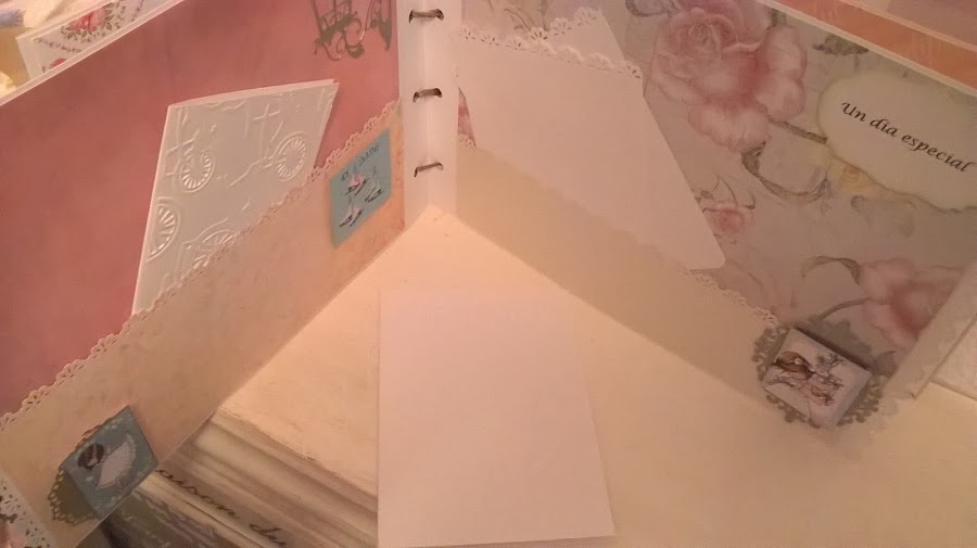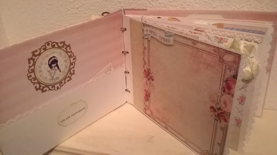 Y otro álbum más de comunión, éste se marcha al Sur. En esta ocasión, 20 páginas y , como en todos, mucho desplegable, cascadas, sobres con tarjetas para firmas de los invitados, bolsillos y hasta una pequeña libreta a modo de diario. Gracias, R. Mrs.Crafter silviahdezmiguel@yahoo.es Tfno 626428584