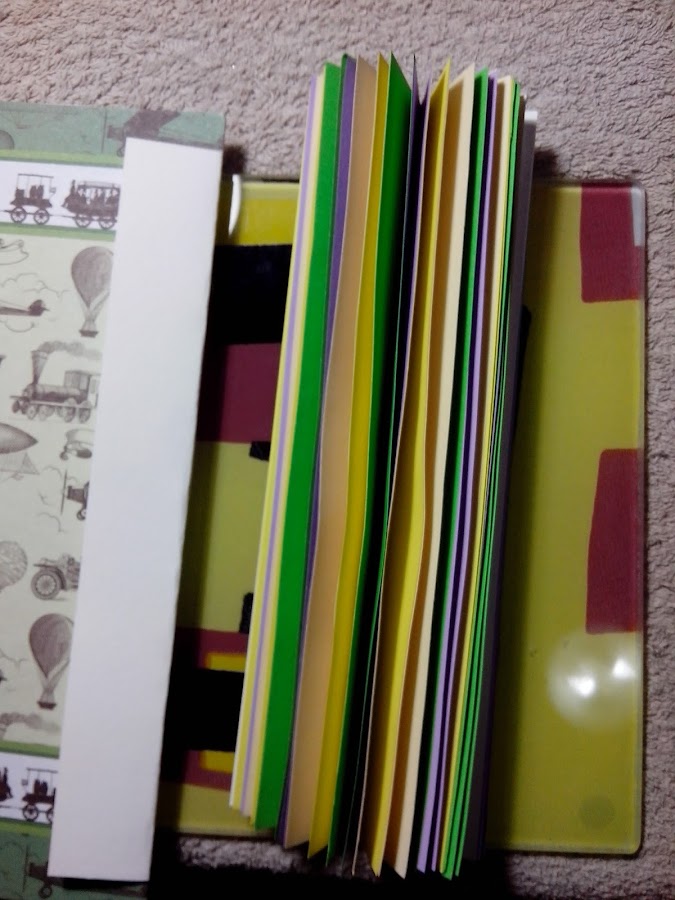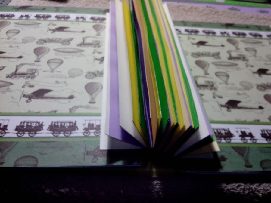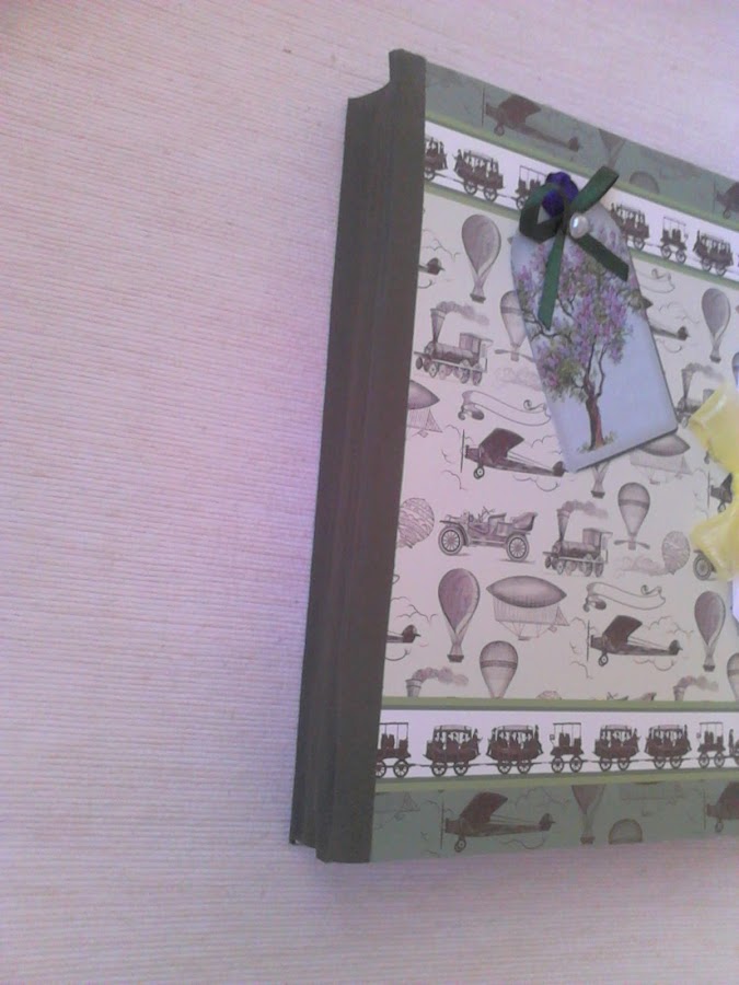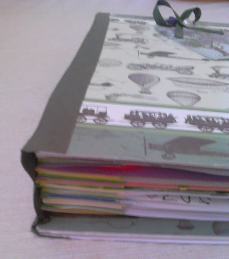 el dilema lo tuve a la hora de ir a encuadernar, ya que al ser las tapas tan duras, no podían meterla en la máquina para encuadernar, así que se me ocurrió hacer un encuadernado casero, con cinta de bies color verde oliva, de 5 cm, que vino perfecta.