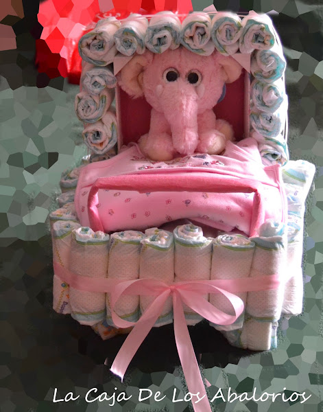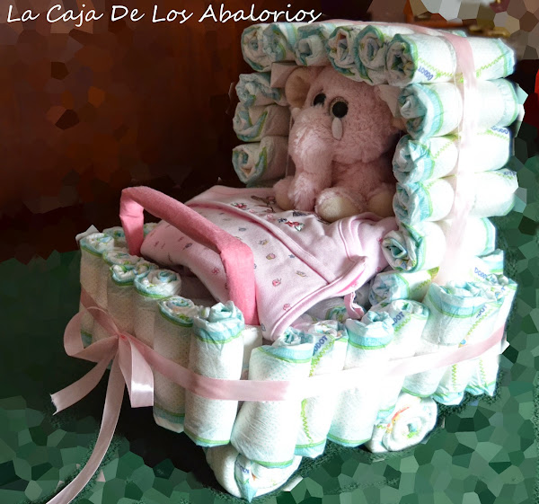 Se trata de un carrito de 74 pañales, con dos cajas de madera decoradas para poder utilizarlas como almacén, un peluche y una mantita para la recién nacida para que por las noches no se destape.