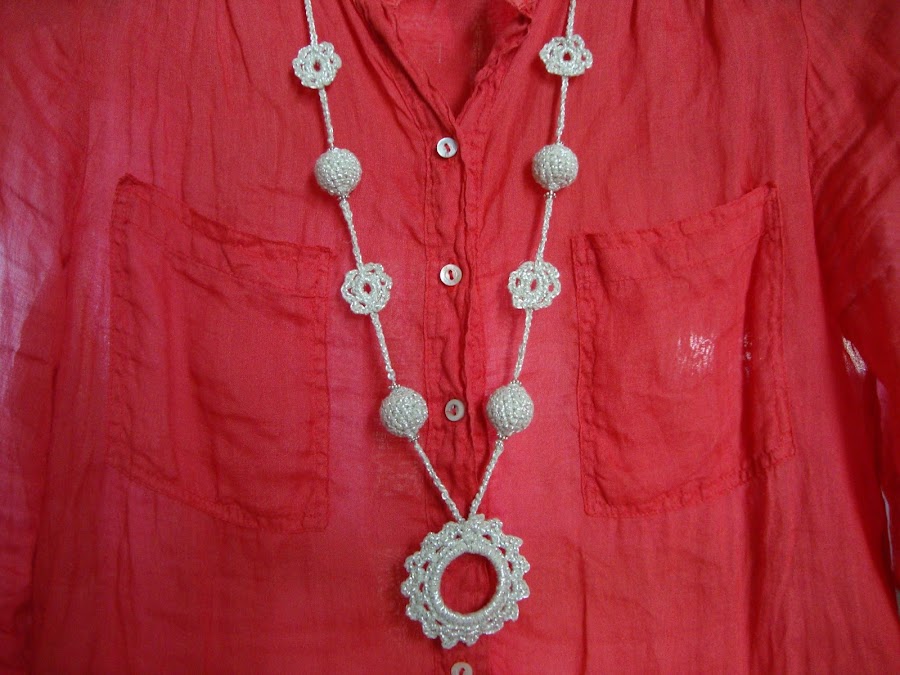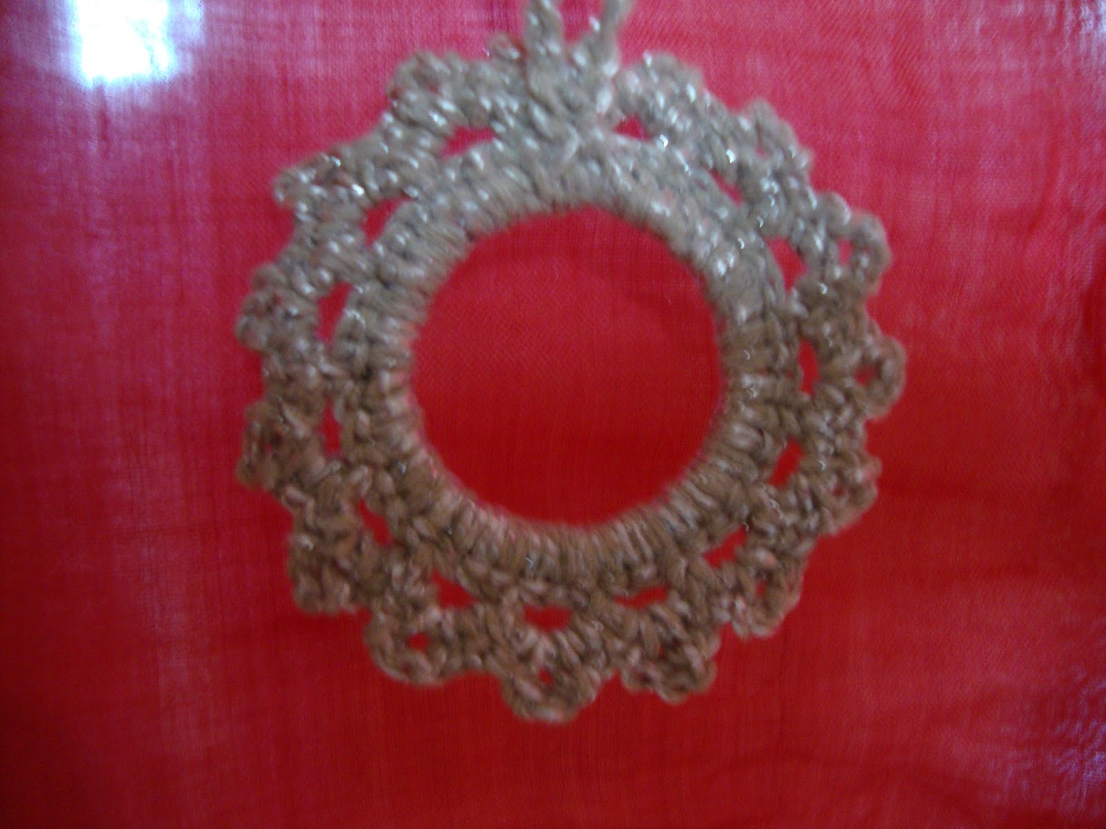 Para el colgante empleé una anilla metálica que forré con puntos bajos muy tupidos. Sobre este anillo hice los mismos pétalos que en las florecillas, cadenetas de 4 enlazadas con un pb pero esta vez me salté 2 puntos (porque aquí ya os digo que van muy juntos).