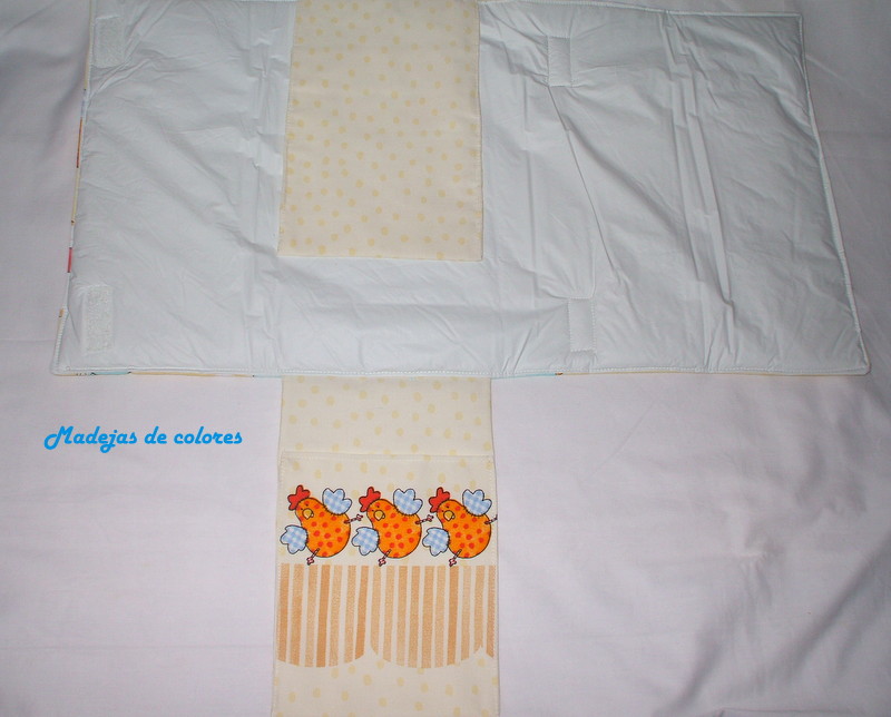 En esta foto abierto por delante, forrado de plástico y 2 bolsillos para pañales y toallitas húmedas.