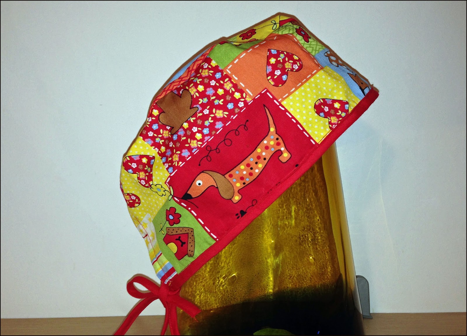 Como podéis ver, la gracia está sobre todo en la tela, que es un algodón 100% con dibujos de corazones y perritos tipo patchwork. Como lleva cintas se ajusta muy bien por detrás, y queda estupendo para pelo largo. Si queréis este modelo de gorro, está a la venta en Artesanum.